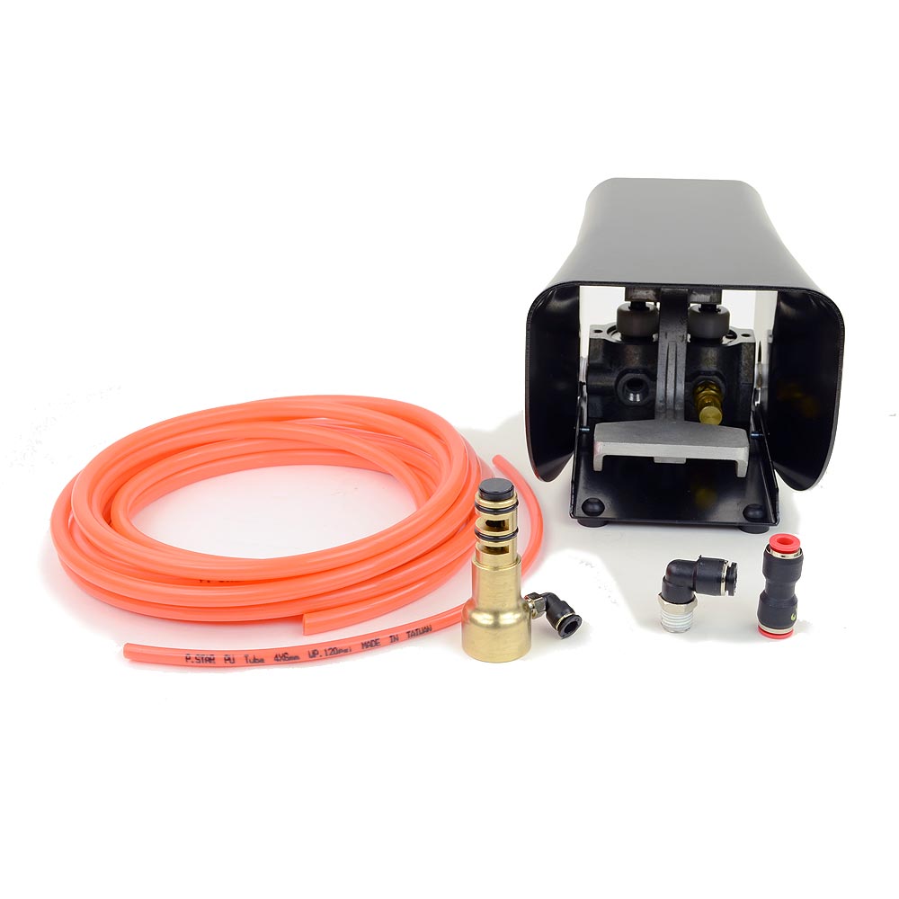 The kit includes remote control trigger valve, inlet plugs, fittings, foot pedal, plastic tubing and instructions.