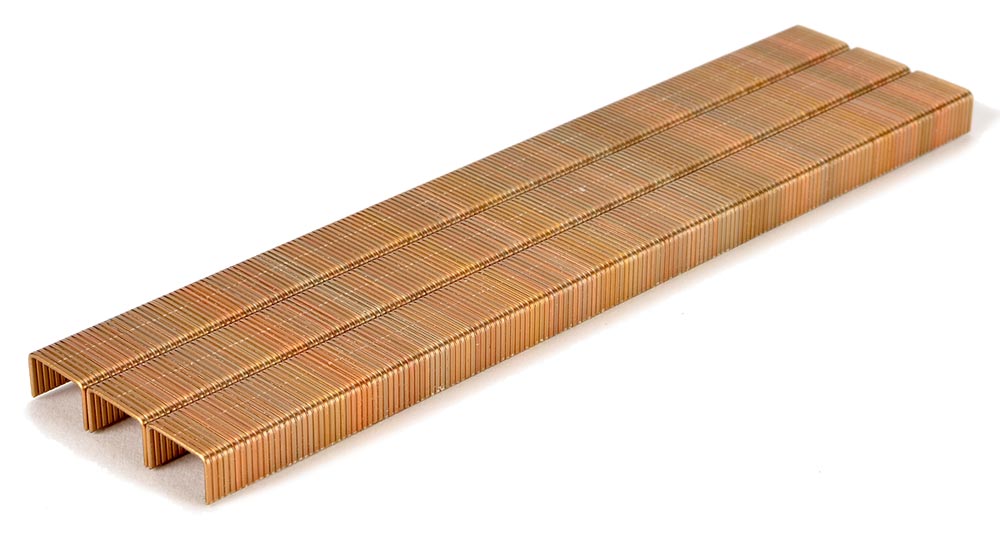 14 series staples. 1/4" leg. Liquor finish. 10,000/box. Made in Europe.