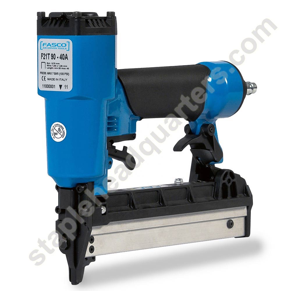 Fasco F21T 90-40A pneumatic staple gun. Uses Senco L 1/4" crown 18 gauge staples. Takes from 3/4" up to 1-9/16" staple leg length (20-40 mm). Staples similar to Atro 90, BeA 90, Prebena EB, Hitachi N3804, Haubold KL 6000, Spotnails 4800, JK 782, Porter Cable NS 100, NS150A. Stainless steel staples available.