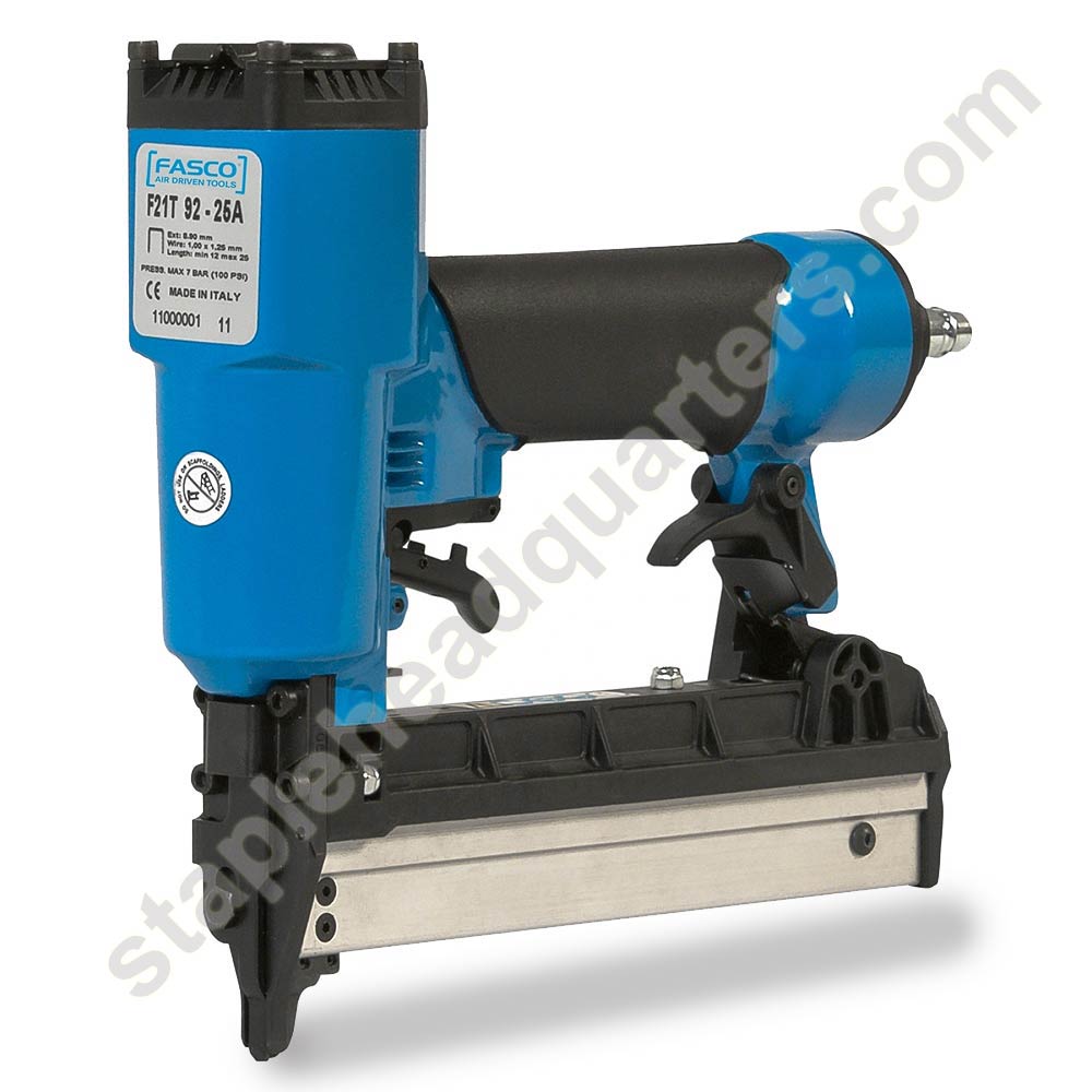 Fasco F21T 92-25A pneumatic staple gun. Uses Bostitch SL5035 5/16" crown 18 gauge staples. Takes from 3/8" up to 1" leg length (19 - 25 mm). Staples are similar to BeA 92/192, Atro 92, Prebena H. Stainless steel and divergent staples available.