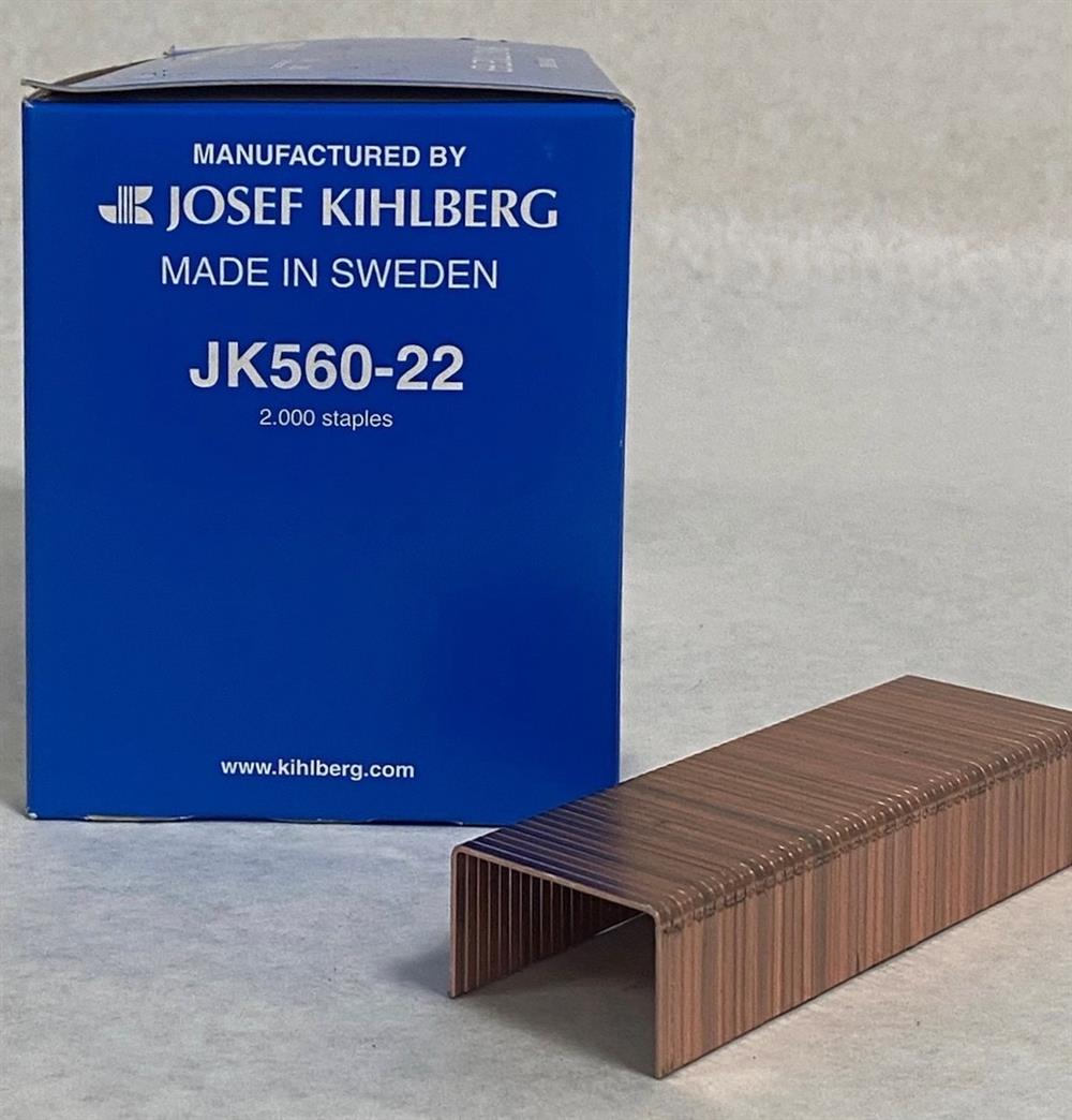 JK560-22 (A-78) carton closing staples, 7/8" leg length, 1-3/8-inch crown. Liquor finish, 20,000 staples per carton. JK brand, made in Sweden.