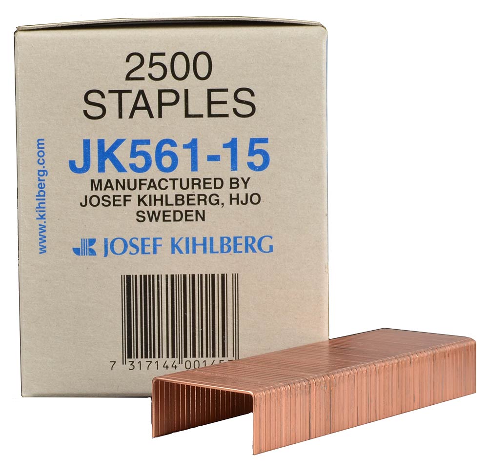 JK561-15 (C-58) carton closing staples, 5/8" leg length, 1-1/4-inch crown. Liquor finish, 25,000 staples per carton. JK brand, made in Sweden.