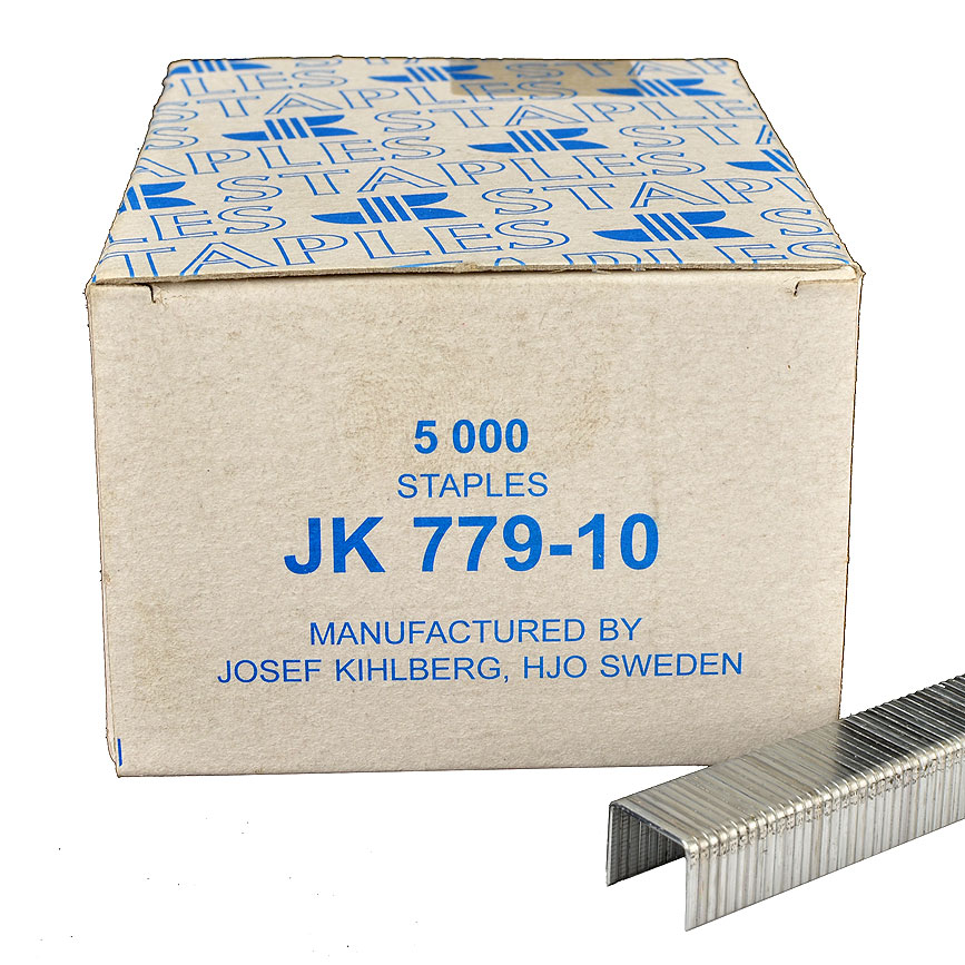 JK779 staples 3/8-inch leg length, 1/2-inch crown, 19 Gauge. Josef Kihlberg brand, made in Sweden.