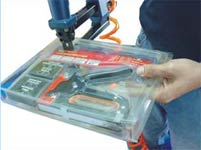 • Applications include carton packaging, end caps, etc. Specially configured B-type anvil for applications which require working around a lip or seam, such as plastic clamshell packaging or raised panel header cards. Also suitable for certain mattress box-spring or upholstery applications where the ability to "reach over" an element of the piece to be fastened is needed.